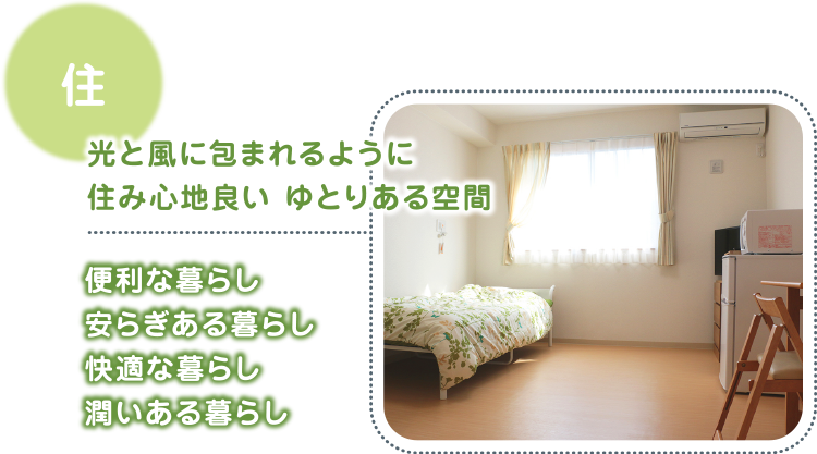 サービス付き高齢者向け住宅は、あくまでも「住宅」です。なごみの風 大友の全てのフロア・設備は、ご入居者様の使いやすさを考えて設計されています。約18㎡の広々とした個室は、ご入居者様のプライベートを守りながら、快適な暮らしをご提供致します。1階フロアと2階フロアの間にはエレベーターが設置されているので、楽々移動ができます。