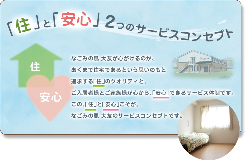 「なごみの風」はもし、介護が必要になっても介護サービスを受けながら住み続ける事ができる『サービス付き高齢者向け住宅』です。
